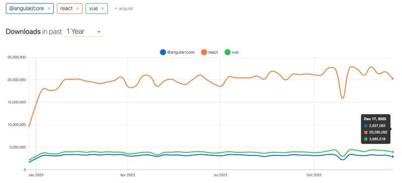 Vue is currently the second most popular frontend framework (according to npm downloads) behind React and slightly ahead of Angular.